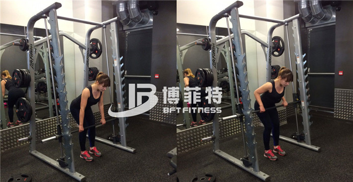 站在史密斯的機(jī)器里,保持你的腳和肩部同寬,用手緊緊握杠鈴的的手把。你的臀部和羅馬尼亞硬拉動(dòng)作保持一致,你的手臂可以完全的伸展。把杠鈴拉向中間部分,暫停,然后慢慢地向下推,完直到全伸直你的手臂。